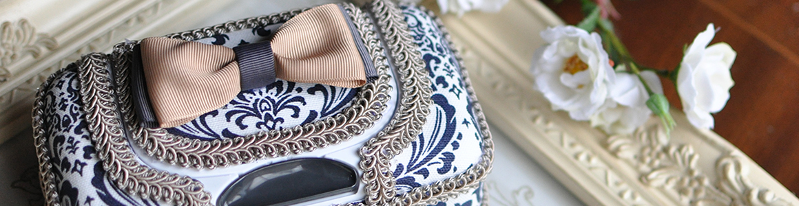 ネイビーのワイプケース。ダマスク柄の輸入生地と、ブレードも輸入物。布地もブレードも同じ紺。シックです。ワイプケース。リビングや玄関に置いてもウエットティッシュには見えません。静岡県 富士宮市 富士市 プリザ 花冠 手作りウェディングブーケ プリザーブドフラワー教室フラワー…