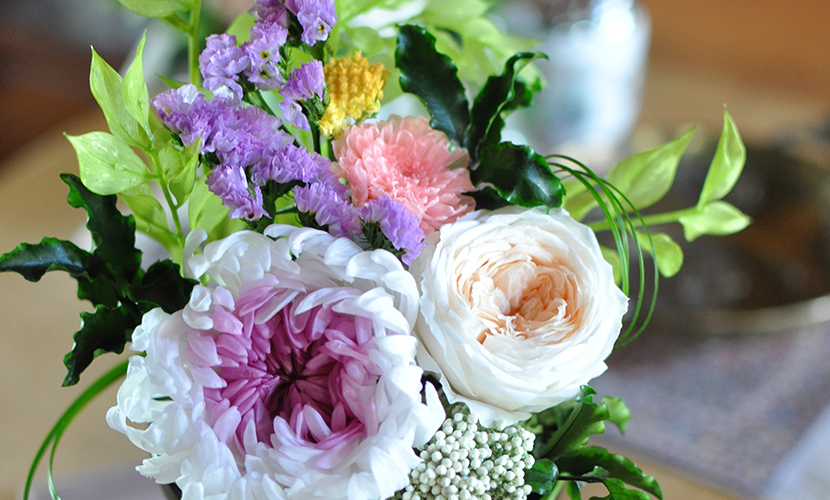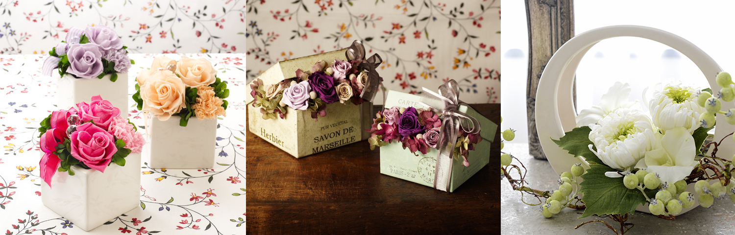 プリザーブドフラワー 仏花コース。インテリアに馴染むモダンタイプなお仏壇の需要が高まるなど、時代に即した仏花デザイン。…