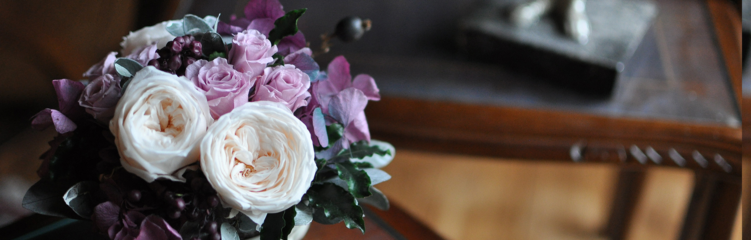 シャビーな背の高い器に、薄紫のプリザーブドフラワーと白の可憐な小さなプリザを組み合わせて。実物のペッパーベリーやユーカリも主張しない色でお作り頂きました。アジサイや葉も、一般的に使われる物とは違う葉色を選んで頂き、最後は流れるラ…
