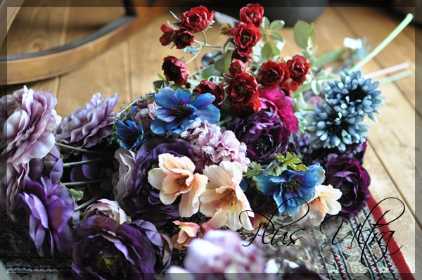 9月趣味のレッスンは背が高いスクエアーの花器に、造花を使った、秋色ボルドーアレンジです。