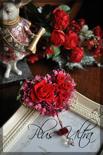 真っ赤な薔薇のプリザーブドフラワーと、ローズの紫陽花を使います。