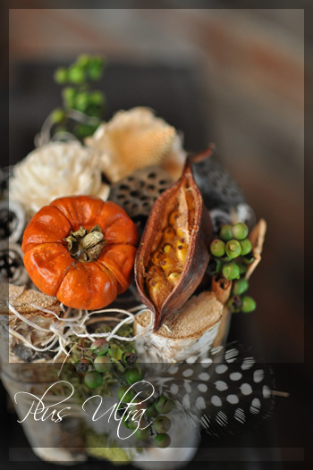 でもあまり可愛い可愛いとか、ザ!ハロウィンです!っていうお花では、その時しか飾れないので、通年楽しんで頂けるよう雑貨風にカッコよく仕上げてみました。