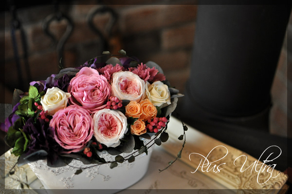 白の丸いプリザをメインにし、サブのプリザは、渋めに。