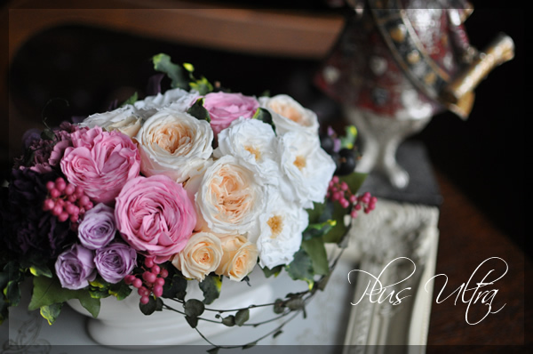 愛らしいオールドローズに、ピンク色のミニバラ、パープルのグラデーションアジサイを差し色に。