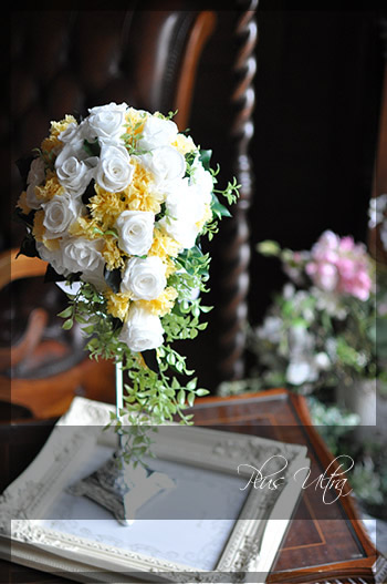 プリザの資格。白と黄色のプリザで、キャスケードブーケ。
