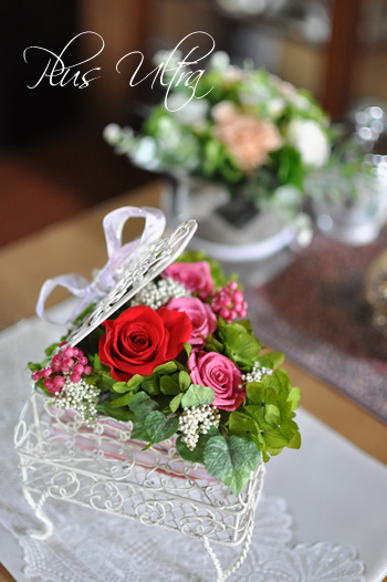 白いピアノベースアレンジに、赤やピンクのプリザーブドフラワーの色が映えます。