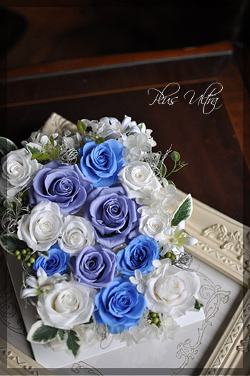 プリザーブドフラワーの白ブルーで、豪華なフレーム。開店祝い。