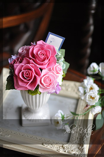 プリザの美しいお花をより引き立たせる、横長のアンティーク調の花器もとっても素敵なんですよ。
