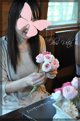 ピンクのオールドローズのプリザーブドフラワーで、ラウンドブーケを手作りしていただきました。